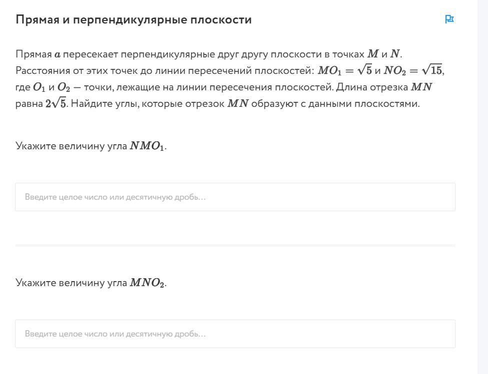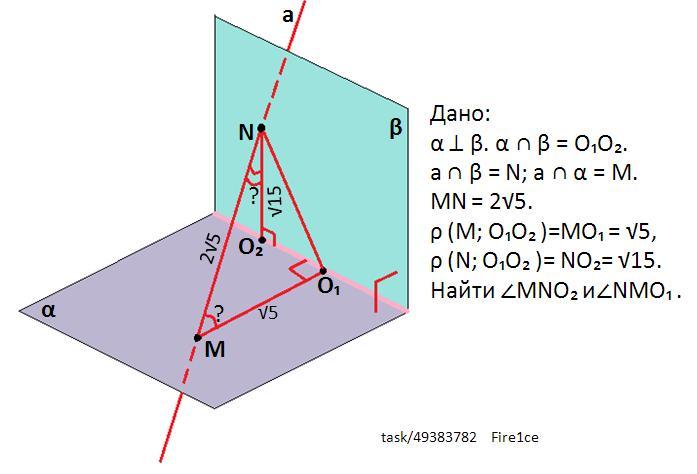 Прямая а пересекает перпендикулярные друг другу плоскости в точках М и N. Расстояния от этих точек до линии пересечений плоскостей: М0₁ = √5 и NО₂ = √15, где О₁ и О₂ - точки, лежащие на линии пересечения плоскостей. Длина отрезка МN равна 2√5. Найдите углы, которые отрезок MN образуют с данными плоскостями.