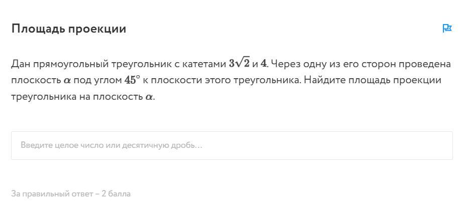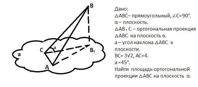 Дан прямоугольный треугольник с катетами 3√2 и 4. Через одну из его сторон проведена плоскость а под углом 45° к плоскости этого треугольника. Найдите площадь проекции треугольника на плоскость а.