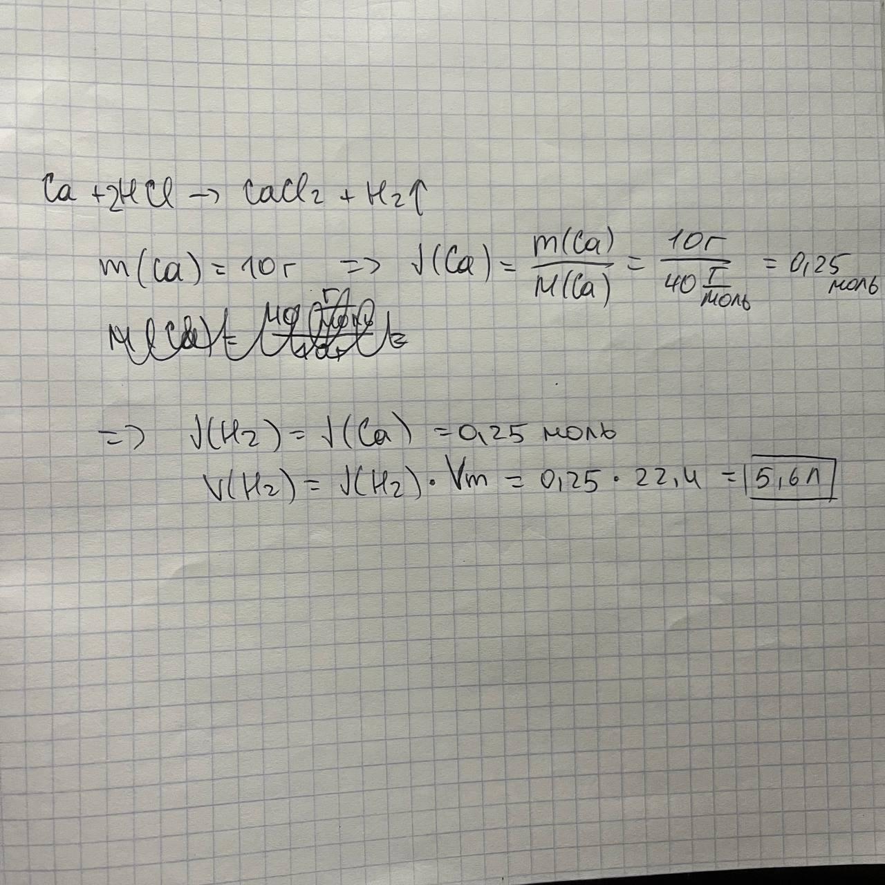 ПОМОГИТЕ ПОЖАЛУЙСТА Вычислить объем водорода (измеренный при н.у.), который выделится при растворении 10 г кальция в соляной кислоте.