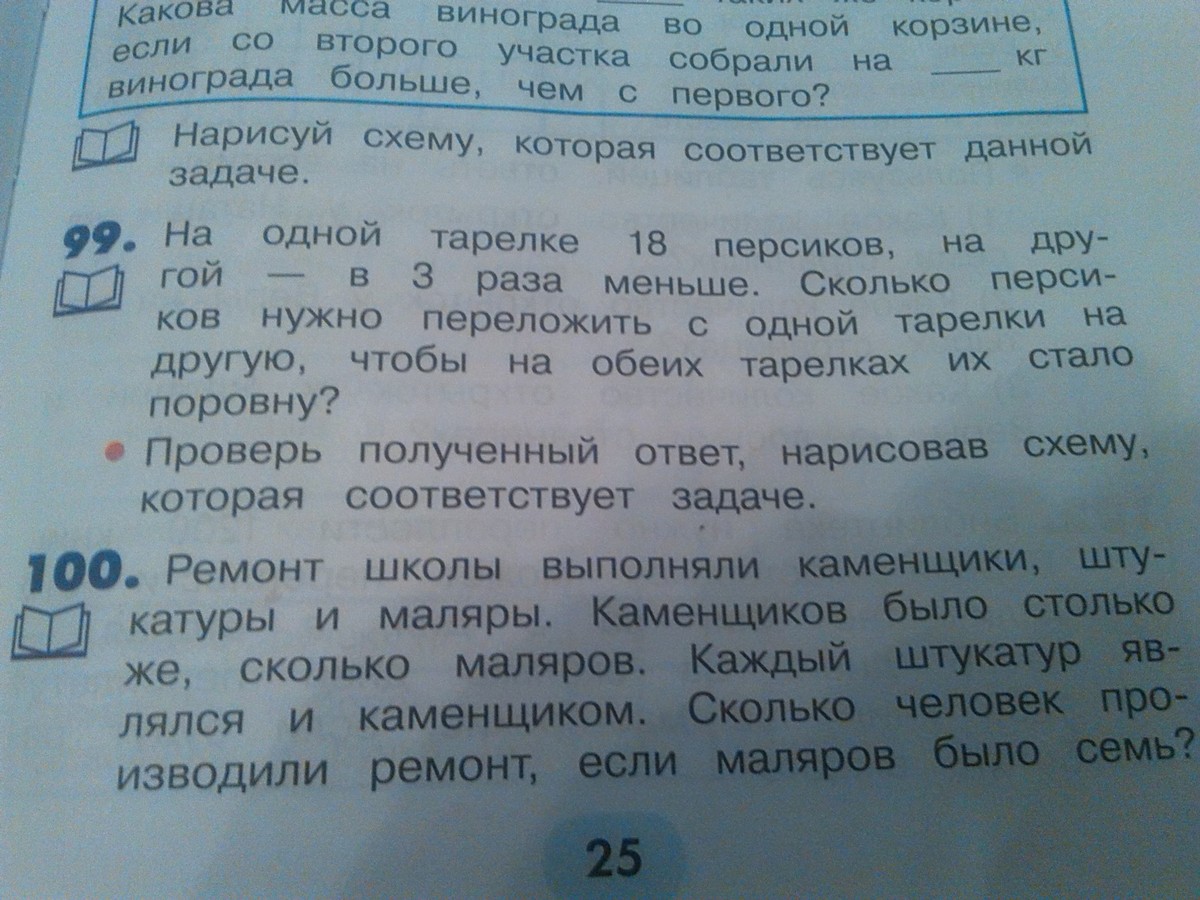 1 действие) 18:3 = 6 (персиков) на 2ой тарелке. 2 действие) 18-6 = 12 (персиков) разница 3действие) 12:2 = 6 (персиков) надо положить на 2ую тарелку
