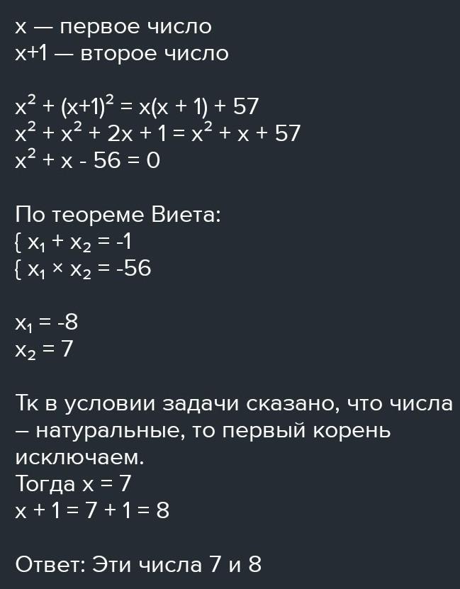 Сума квадратів двох послідовних натуральних чисел більша добутку цих чисел на 43. Знайти ці числа.