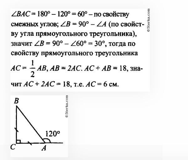 В прямоугольном треугольнике ABC с прямым углом C внешний угол при вершине А равен 120,АС+АВ=18 см. Найти АС и АВ.