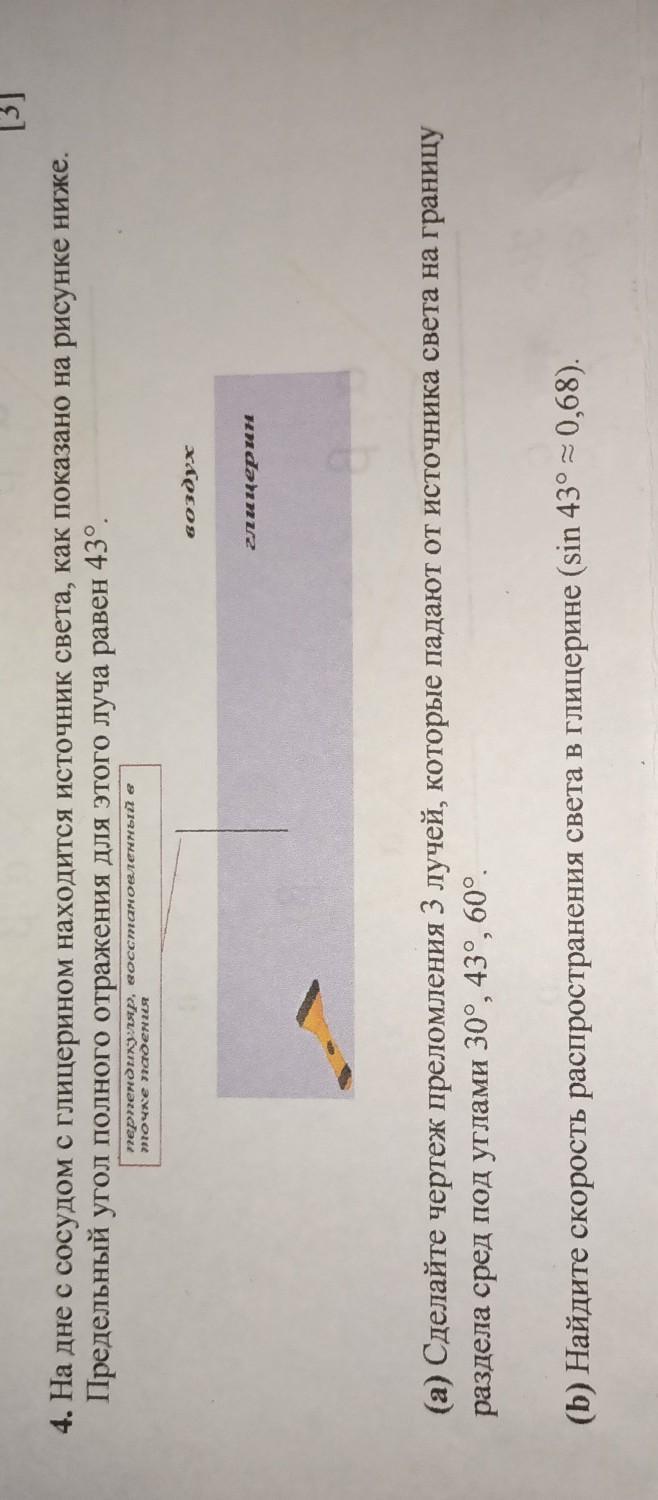 (а) Сделайте чертеж преломления 3 лучей, которые падают от источника света на границу раздела сред под углами 30°, 43°, 60°. (b) Найдите скорость распространения света в глицерине (sin 43° ≈ 0,68)