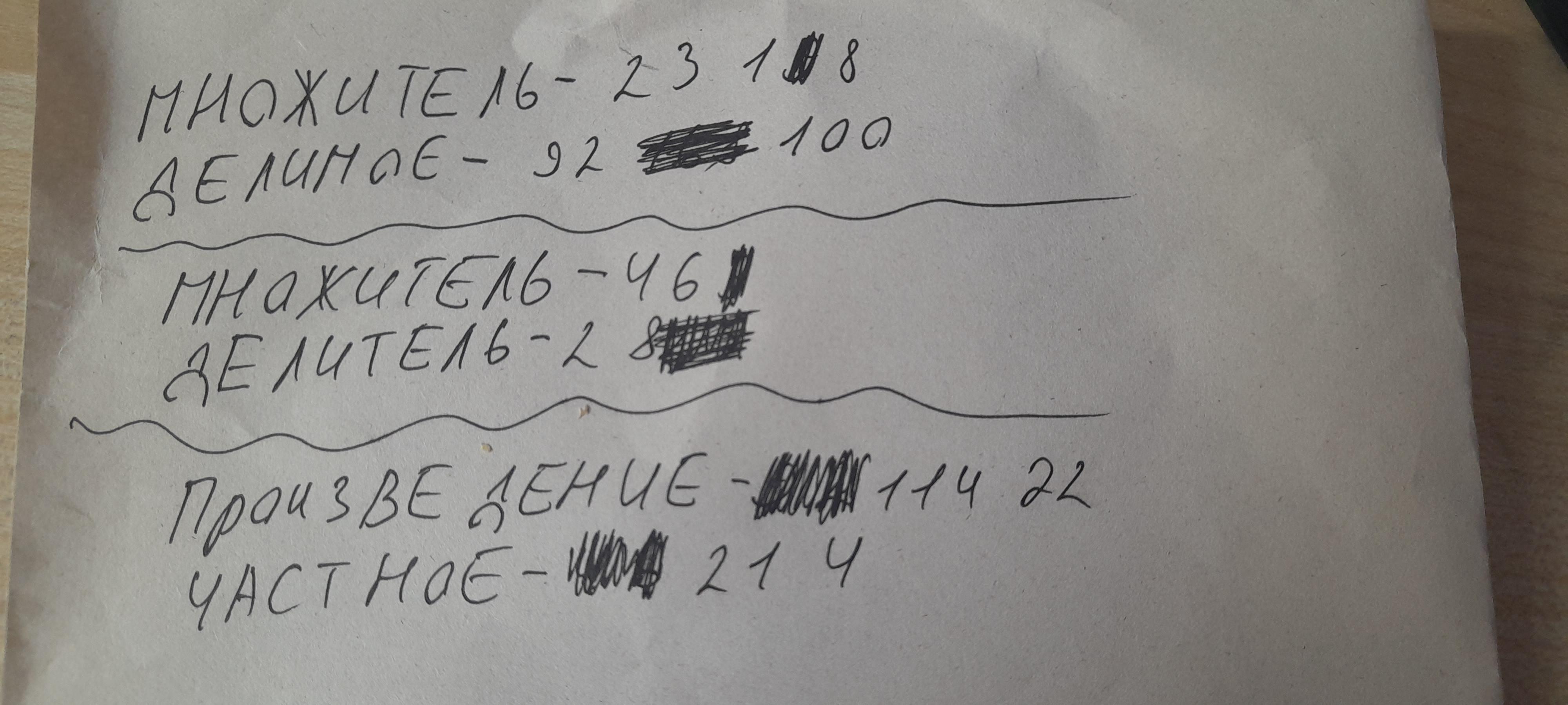 1. Заполни таблицу: Множитель 23 18 Делимое 92 100 Множитель 4 6 Делитель 2 8 Произведение 114 72 Частное 21 4