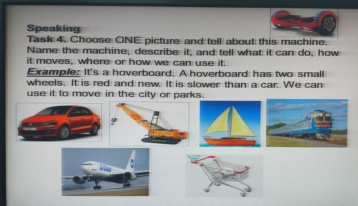 l chose Machine. The car has four wheels. The car is red. The car is faster than the bus. We use it to get somewhere far away.