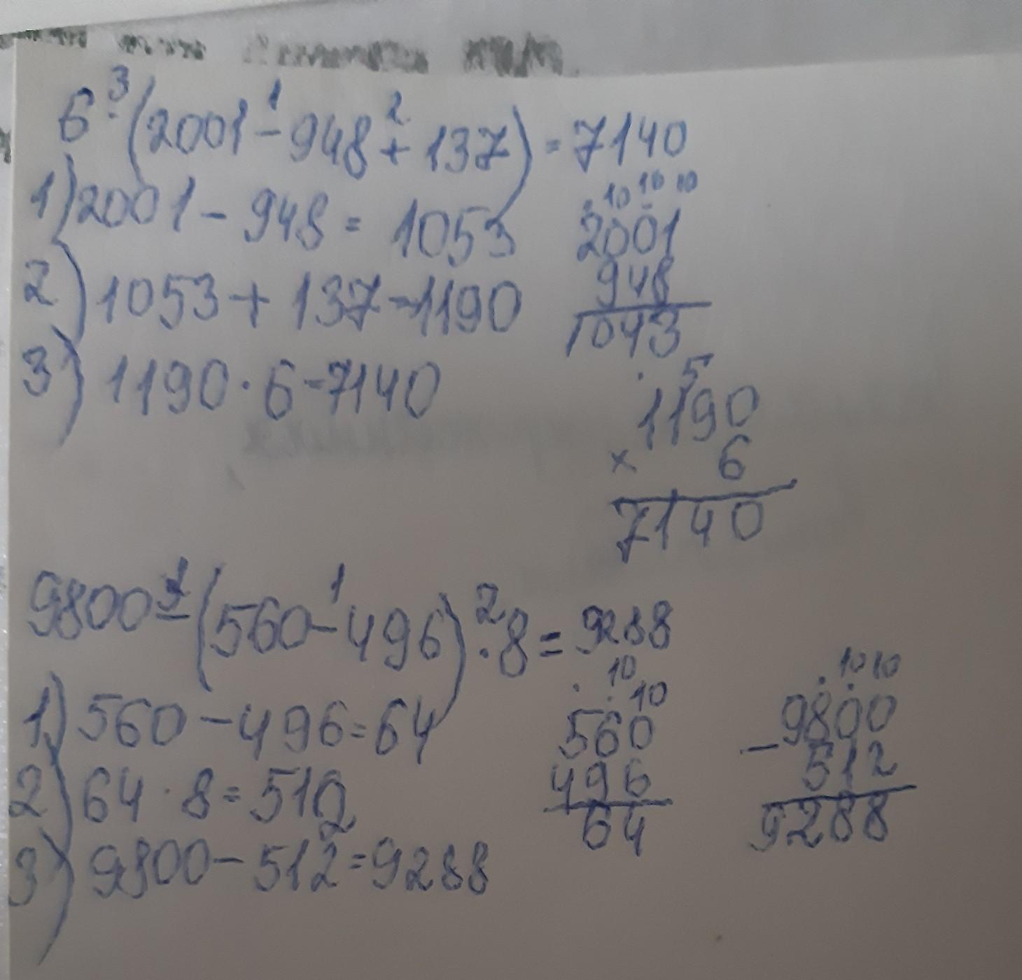 6*(2001-948+137) 9800-(560-496)*8 решить по действиям 1) 2) и так дале