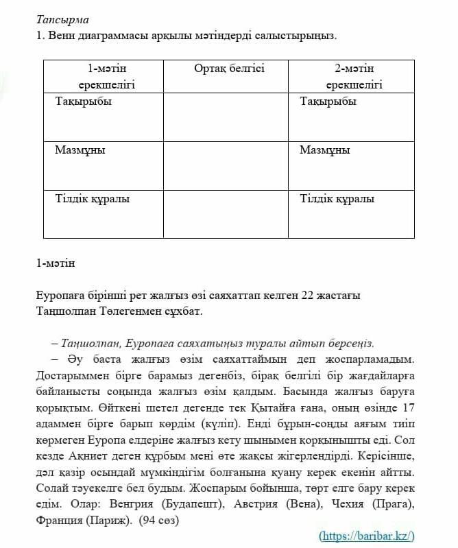 Тапсырма 1. Венн диаграммасы арқылы мәтіндерді салыстырыңыз. Ортақ белгісі 1-мәтін ерекшелігі Тақырыбы 2-мәтін ерекшелігі Тақырыбы Мазмұны Мазмұны Тілдік құралы Тілдік құралы 1-мәтін Еуропаға бірінші рет жалғыз өзі саяхаттап келген 22 жастағы Таңшолпан Төлегенмен сұхбат. — Таңшолпан, Еуропаға саяхатыңыз туралы айтып берсеңіз. – Әу баста жалғыз өзім саяхаттаймын деп жоспарламадым. Достарыммен бірге барамыз дегенбіз, бірақ белгілі бір жағдайларға байланысты соңында жалғыз өзім қалдым. Басында жалғыз баруға қорықтым. Өйткені шетел дегенде тек Қытайға ғана, оның өзінде 17 адаммен бірге барып көрдім (күліп). Енді бұрын-соңды аяғым тиіп көрмеген Еуропа елдеріне жалғыз кету шынымен қорқынышты еді. Сол кезде Ақниет деген құрбым мені өте жақсы жігерлендірді. Керісінше, дәл қазір осындай мүмкіндігім болғанына қуану керек екенін айтты. Солай тәуекелге бел будым. Жоспарым бойынша, төрт елге бару керек едім. Олар: Венгрия (Будапешт), Австрия (Вена), Чехия (Прага), Франция (Париж). (94 сөз)