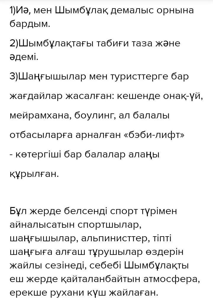 Шымбұлақ» демалыс орнының анықтама бөліміне телефон соқ. Мәтін мазмұнына сүйеніп, демалыс орнындағы қызмет түрлері мен төлемдер туралы сұра. Диалогте: «Кешіріңіз», «Ғафу етіңіз», «бола ма?», «Айтып жіберіңізші», «Қайталап жіберіңізші», «айтпас па екенсіз?», «Көп рақмет!»рақмез