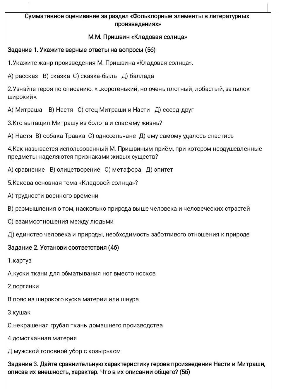 Суммативное оценивание за раздел «Фольклорные элементы в литературных произведениях>> М.М. Пришвин «Кладовая солнца» Задание 1. Укажите верные ответы на вопросы (56) 1. Укажите жанр произведения М. Пришвина «Кладовая солнца». А) рассказ В) сказка С) сказка-быль Д) баллада 2. Узнайте героя по описанию: ....коротенький, но очень плотный, лобастый, затылок широкий». А) Митраша В) Настя С) отец Митраши и Насти Д) сосед-друг 3.Кто вытащил Митрашу из болота и спас ему жизнь? А) Настя В) собака Травка С) односельчане Д) ему самому удалось спастись 4. Как называется использованный М. Пришвиным приём, при котором неодушевленные предметы наделяются признаками живых существ? А) сравнение В) олицетворение С) метафора Д) эпитет 5.Какова основная тема «Кладовой солнца»? А) трудности военного времени В) размышления о том, насколько природа выше человека и человеческих страстей С) взаимоотношения между людьми Д) единство человека и природы, необходимость заботливого отношения к природе Задание 2. Установи соответствия (46) 1.картуз А.куски ткани для обматывания ног вместо носков 2.Портянки В.пояс из широкого куска материи или шнура 3.кушак С.Некрашеная грубая ткань домашнего производства 4.домотканная материя Д.мужской головной убор с козырьком Задание 3. Дайте сравнительную характеристику героев произведения Насти и Митраши, описав их внешность, характер. Что в их описании общего? (56)