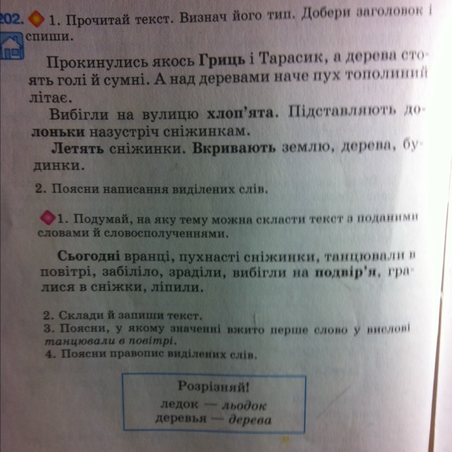 Напевно так : Сьогодні вранці було похмуро . Раптом з неба випали пухнасті сніжинки . Вони ніби танцювали в повітрі . Все навколо забіліло . Дітлахи дуже зраділи . Вони вибігли на подвір ' я . Діти гралися в сніжки , навіть почали ліпити снігову бабу і фортецю .