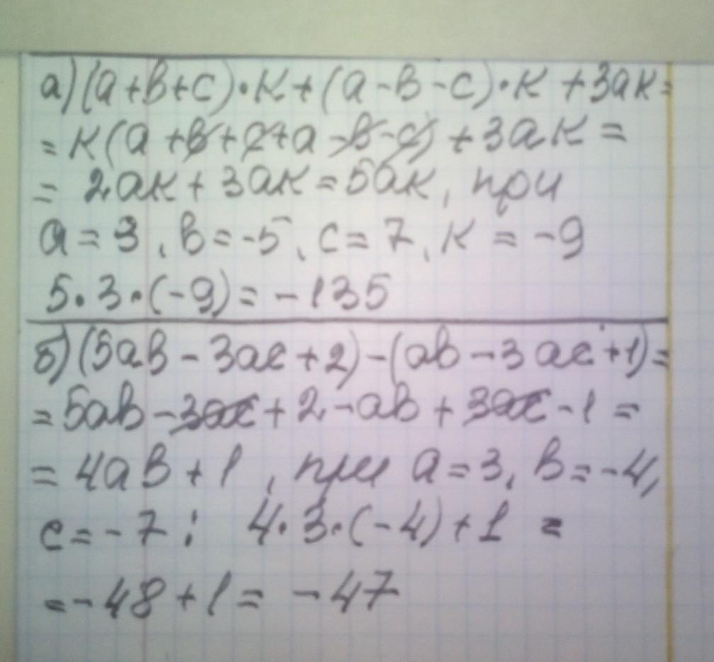 a) (a + b + c) · k + (a – b – c) · k + 3ak при а = 3; b = -5; с = 7; k = -9;