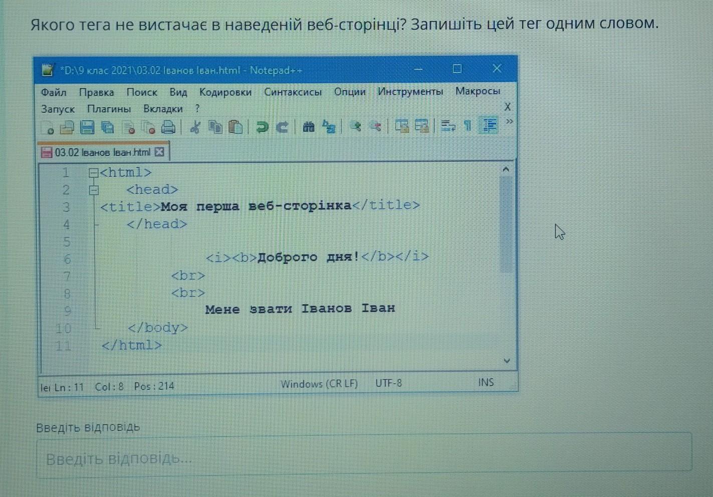 Якого тега не вистачає в наведеній веб сторінці? запишіть відповідь одним словом