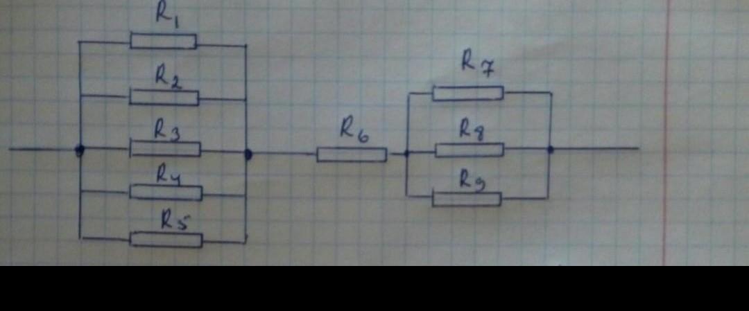 Визначити загальний опір мішаного з'єднання R1=10 ом R2=10ом R3=10ом R4=10ом R5=10 ом R6 = 5ом R7= 6ом R8= 6ом R9= 6ом пожалуйста ( оформление как задача)