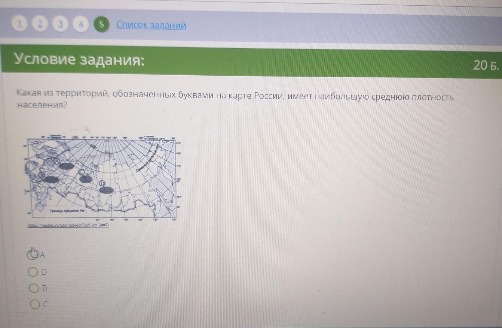 Условие задания: Какая из территорий, обозначенных. буквами на карте России, имеост наибольшую среднюю плотность населения? A D B S Я