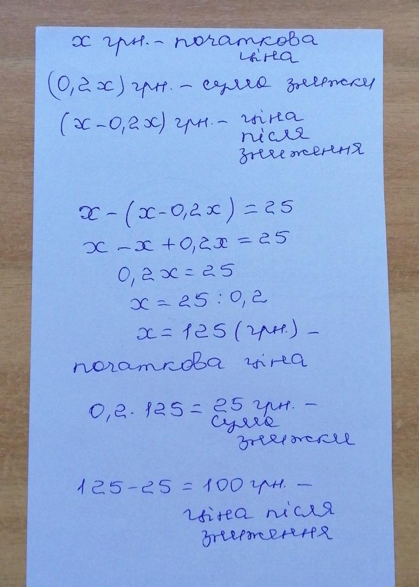 3) 125 - 25 = 100 грн - стільки коштує тканина після знишки;
