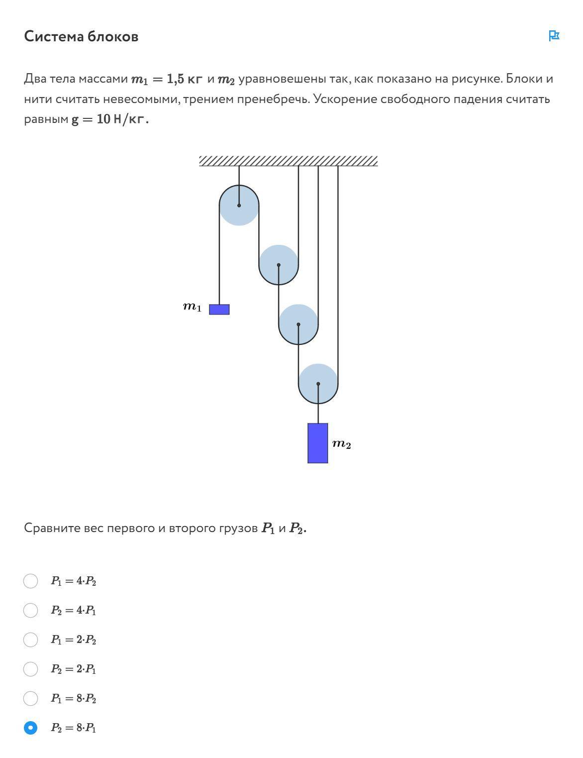 Два тела массами m1=1,5 кг и m2 уравновешены так, как показано на рисунке. Определите массу второго тела m2. Блоки и нити считать невесомыми, трением пренебречь. Ускорение свободного падения считать равным g=10H/кг.