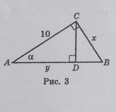 tg\alpha  = \frac{x}{10} \\x = 10*tg\alpha \\cos\alpha  = \frac{y}{10} \\y = cos\alpha *10