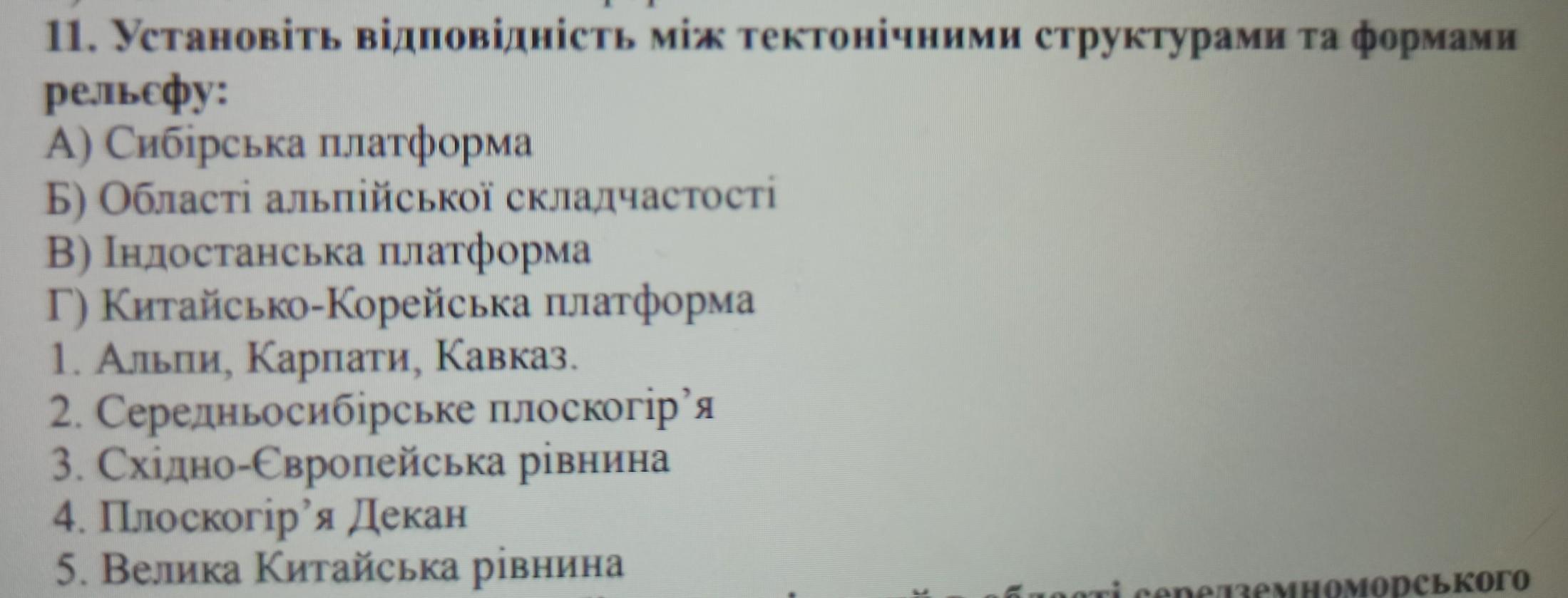 11. Установіть відповідність між тектонічними структурами та формами рельєфу: А) Сибірська платформа Б) Області альпійської склад середземноморського
