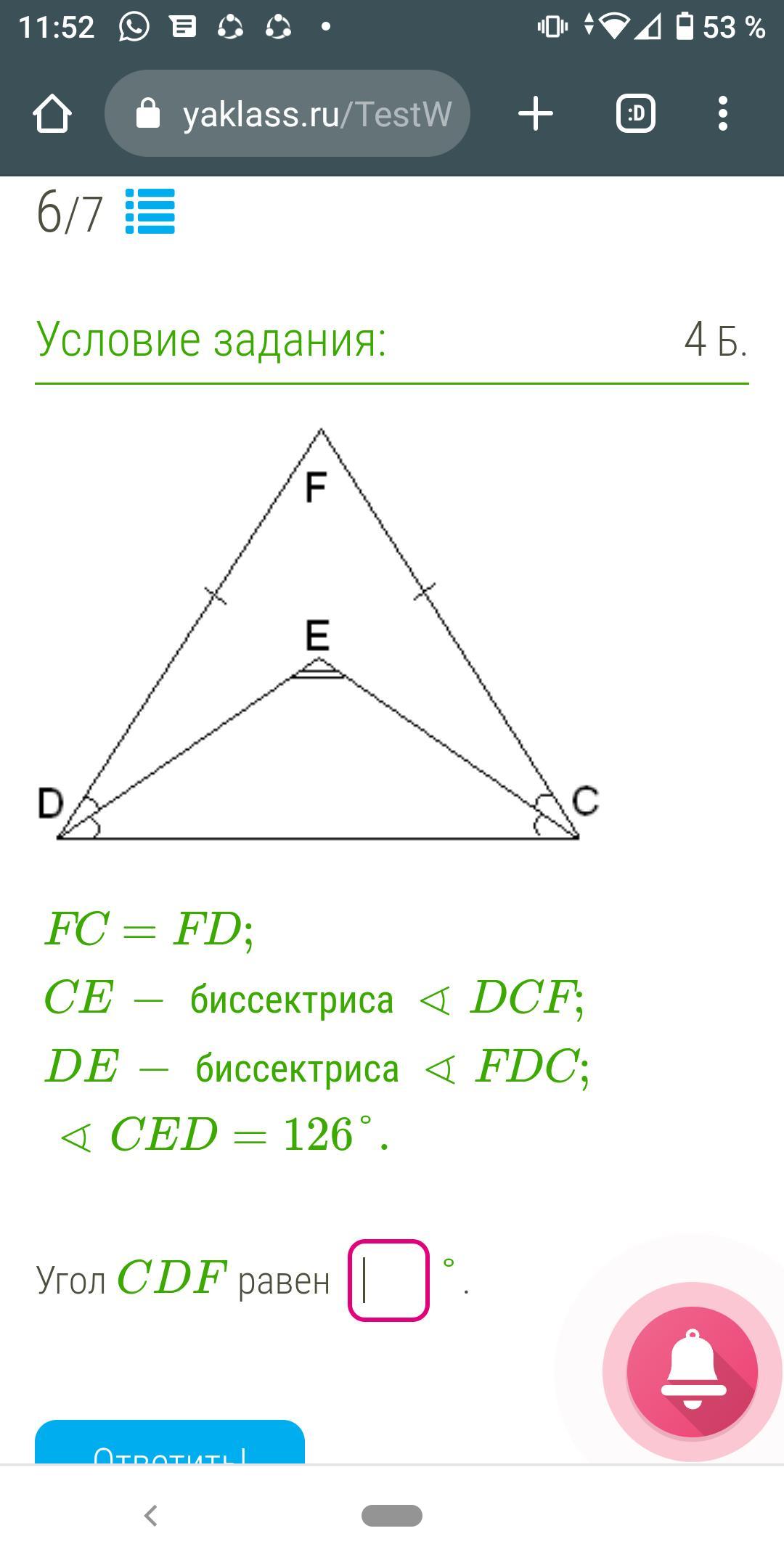 ∠FCE=∠CDE=∠EDF∠ECD = (180°-∠CED):2 = (180-126): 2 = 54:2 = 27°