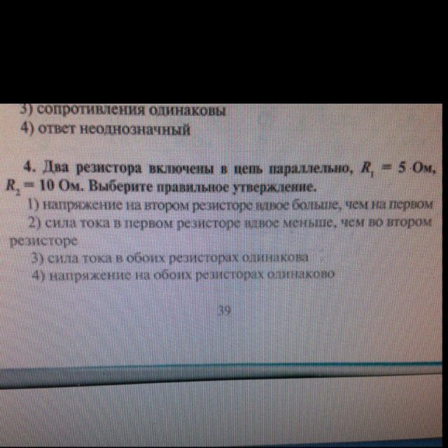 Ответ: 4)напряжение на обоих резисторах одинаковое.