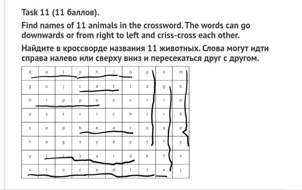 Task 11 (11 баллов). Find names of 11 animals in the crossword. The words can go downwards or from right to left and criss-cross each other. Найдите в кроссворде названия 11 животных.