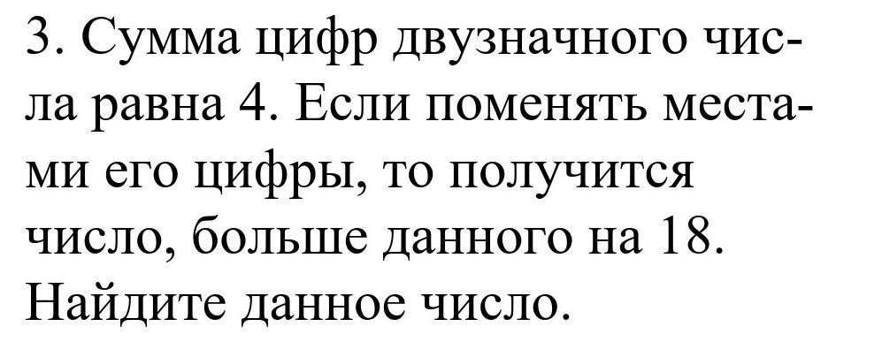 Сумма цифр двузначного чис ла равна 4. Если поменять места ми его цифры, то получится число, больше данного на 18. Найдите данное число.