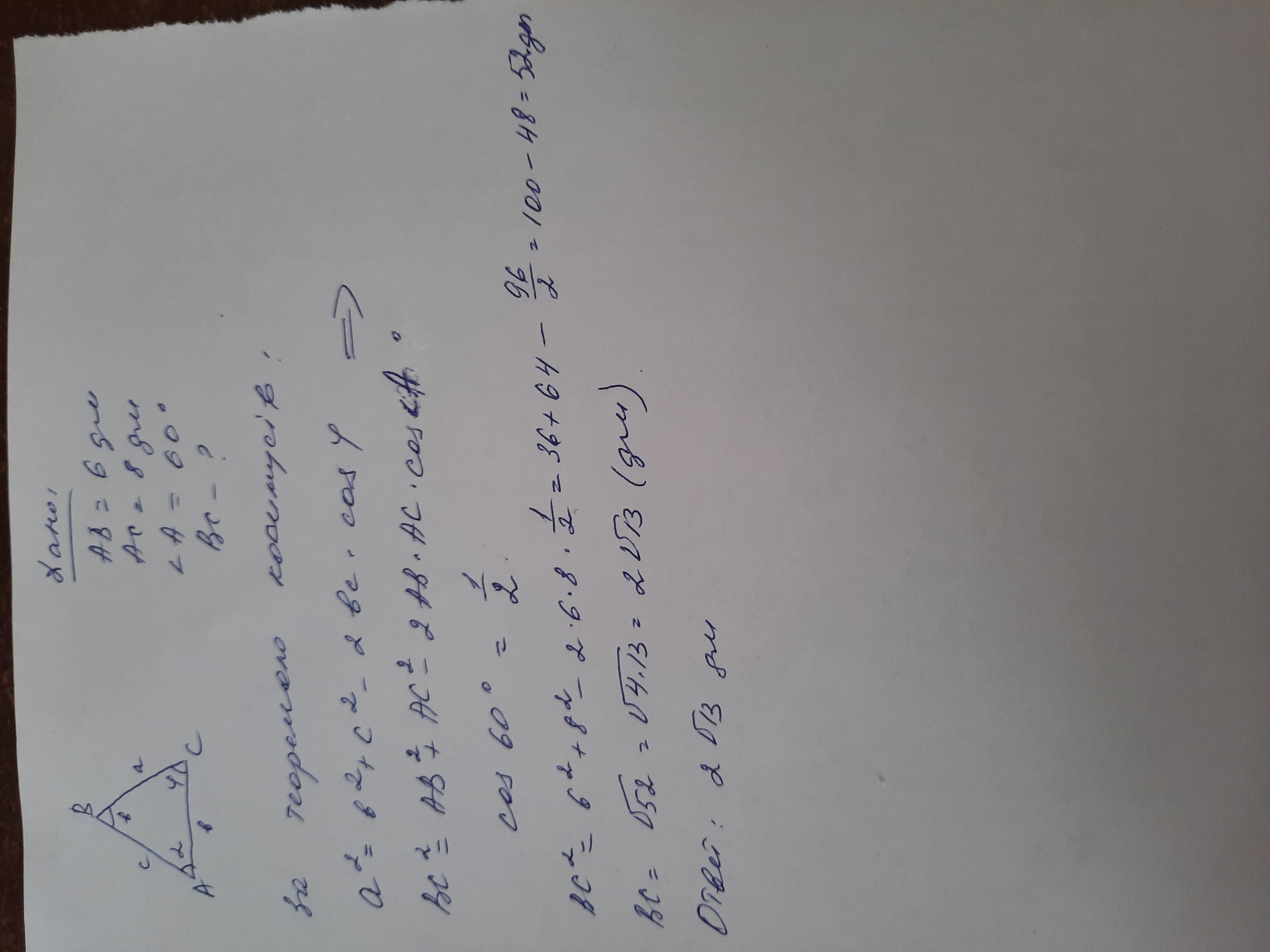 Дві сторони трикутника дорівнюють 6 дм і 8 дм, а кут між ними 60°. Знайдіть невідому сторону трикутника.