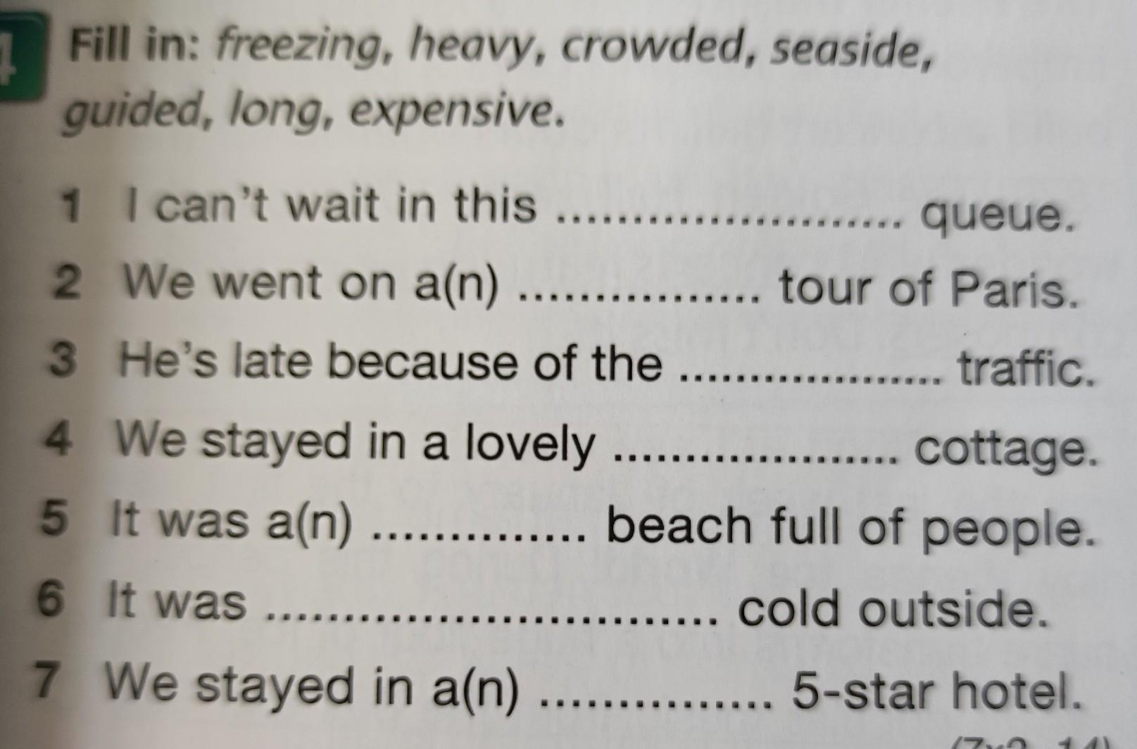 Fill in: freezing, heavy, crowded, seaside, guided, long, expensive.