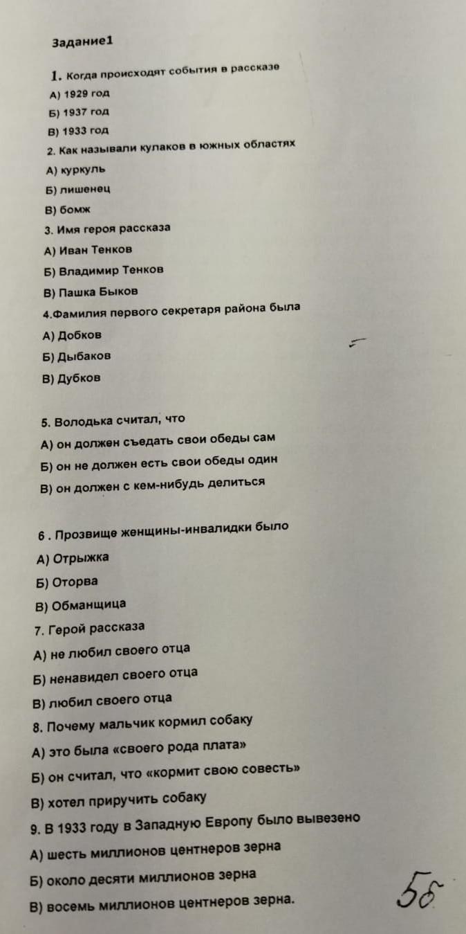 1. Когда происходят события в рассказе A) 1929 год Б) 1937 год B) 1933 год 2. Как называли кулаков в южных областях А) куркуль Б) лишенец В) бомж 3. Имя героя рассказа А) Иван Тенков Б) Владимир Тенков B) Пашка Быков 4.Фамилия первого секретаря района была A) Добков Б) Дыбаков В) Дубков 5. Володька считал, что А) он должен съедать свои обеды сам Б) он не должен есть свои обеды один В) он должен с кем-нибудь делиться 6. Прозвище женщины-инвалидки было А) Отрыжка Б) Оторва В) Обманщица 7. Герой рассказа А) не любил своего отца Б) ненавидел своего отца В) любил своего отца 8. Почему мальчик кормил собаку A) это была «своего рода плата» Б) он считал, что «кормит свою совесть» В) хотел приручить собаку 9. В 1933 году в Западную Европу было вывезено А) шесть миллионов центнеров зерна Б) около десяти миллионов зерна В) восемь миллионов центнеров зерна.