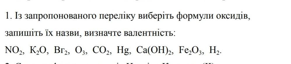 1. Із запропонованого переліку виберіть формули оксидів, запишіть їх назви, визначте валентність: NO2, К2О, Вг2 , O3, CO2 , Hg, Ca(OH)2 , Fe203, H2.