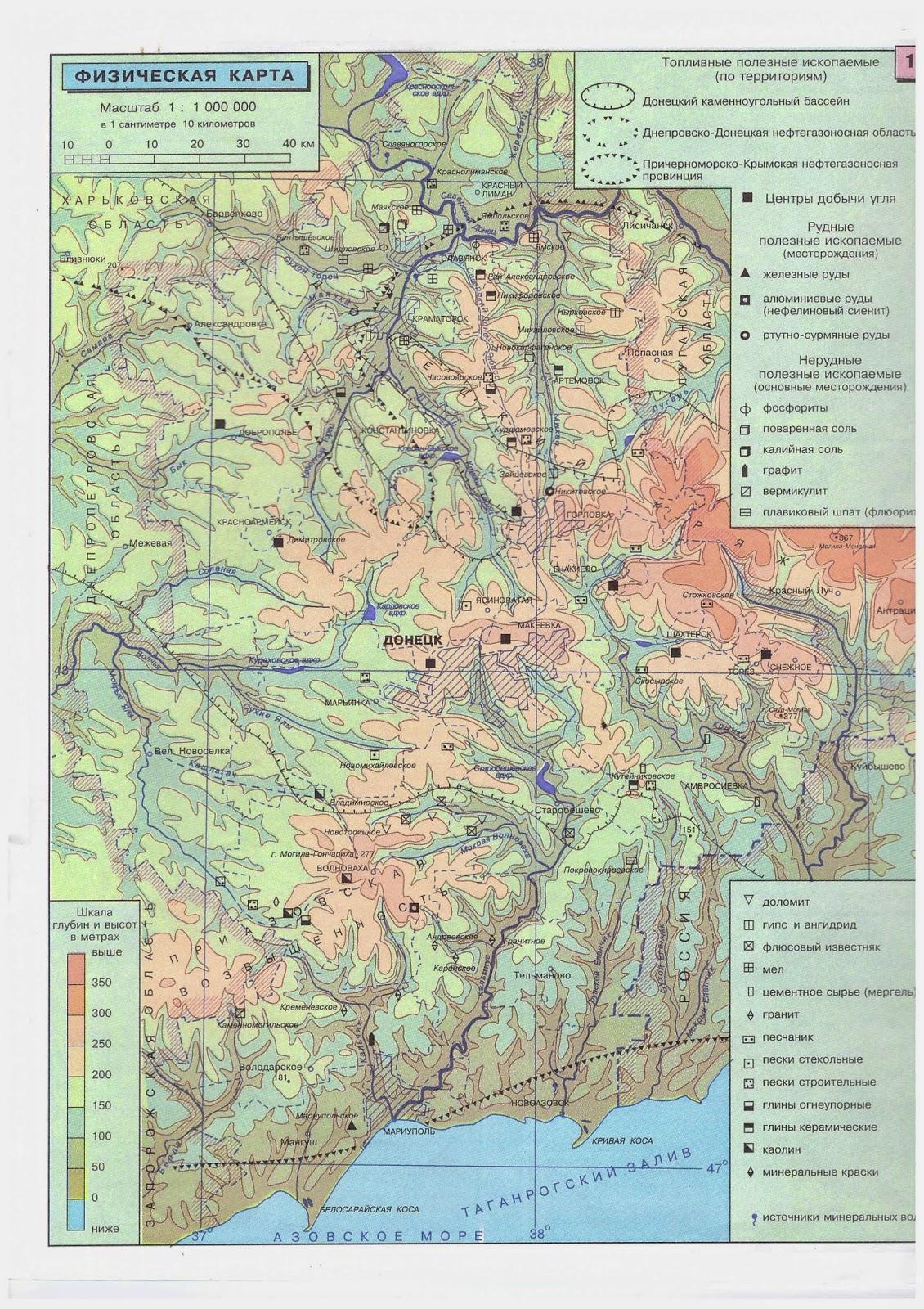 - Рельеф преобладает равнинный с балками и оврагами.На северо-востоке есть Донецкий кряж с высотами до 360 метров, поверхность которого изрезана долинами рек.На юге-Приазовская возвышенность, на западе-Приднепровская низменность, возле Азовского моря-Приазовская низменность.
