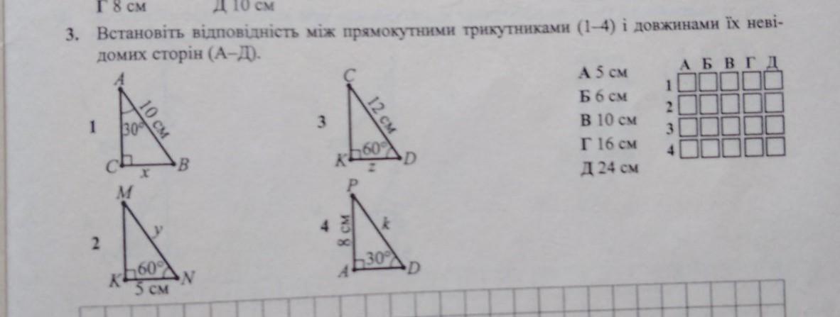 встановіть відповідність між прямокутними трикутниками і довжинами їх невідомих сторін