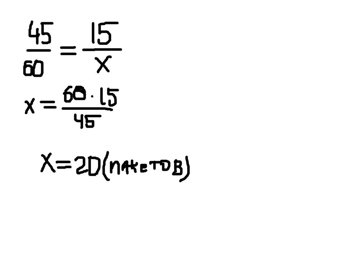 1) 45 : 15 = 3 (кг) - в 1 пакете