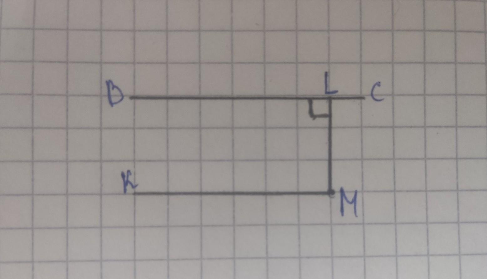 Побудувати пряму ВС. Вибрати точку М поза прямою. За допомогою косинця і мінійки побудувати пряму ML, перпендикулярну до прямої ВС, та пряму мк, паралельну прямій BC.