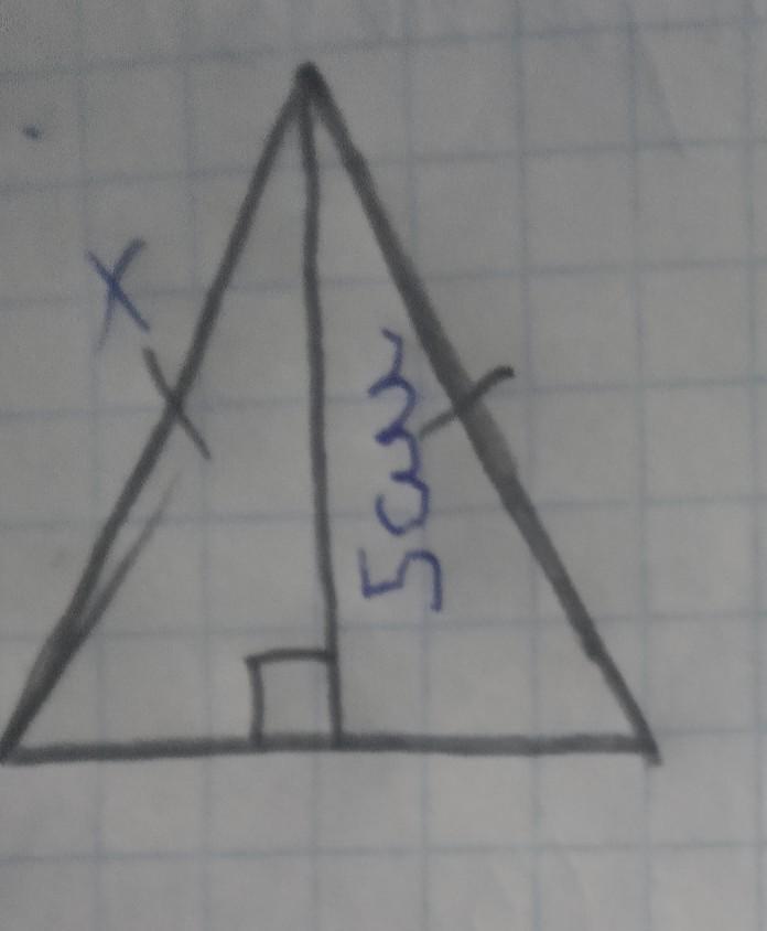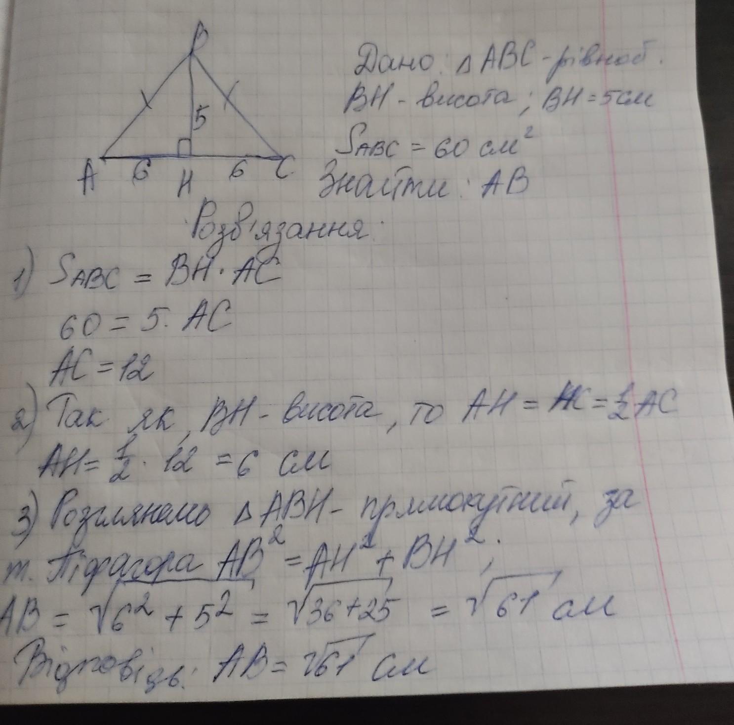 Якщо площа рівнобедреного трикутника 60 см2, а висота, проведена до основи - 5 см, то бічна сторона дорівнює