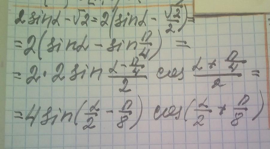 2sina-√2=2(sina -√2/2)=2(sina -sin(пи/4) и дальше по формуле разность синусов