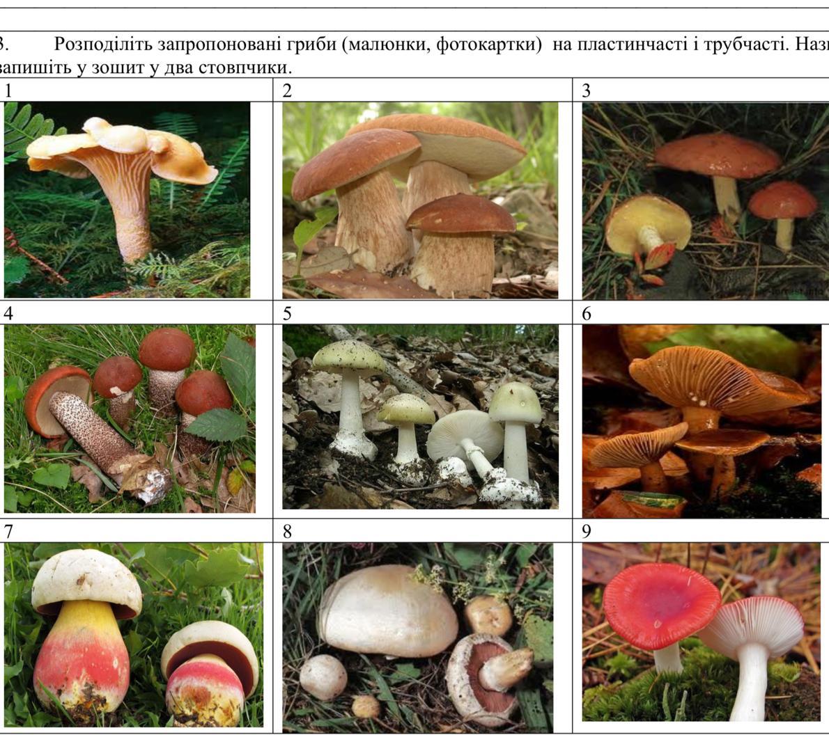 Розподіліть запропоновані гриби (малюнки, фотокартки) на пластинчасті і трубчасті. Назви запишіть у зошит у два стовпчики.