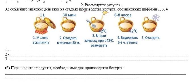 2. Рассмотрите рисунок. А) объясните значение действий на стадиях производства йогурта, обозначенных цифрами 1, 3, 4  1 - ______________________________________________________________________________________ 2 - _______________________________________________________________________________________ 3 - _______________________________________________________________________________________
