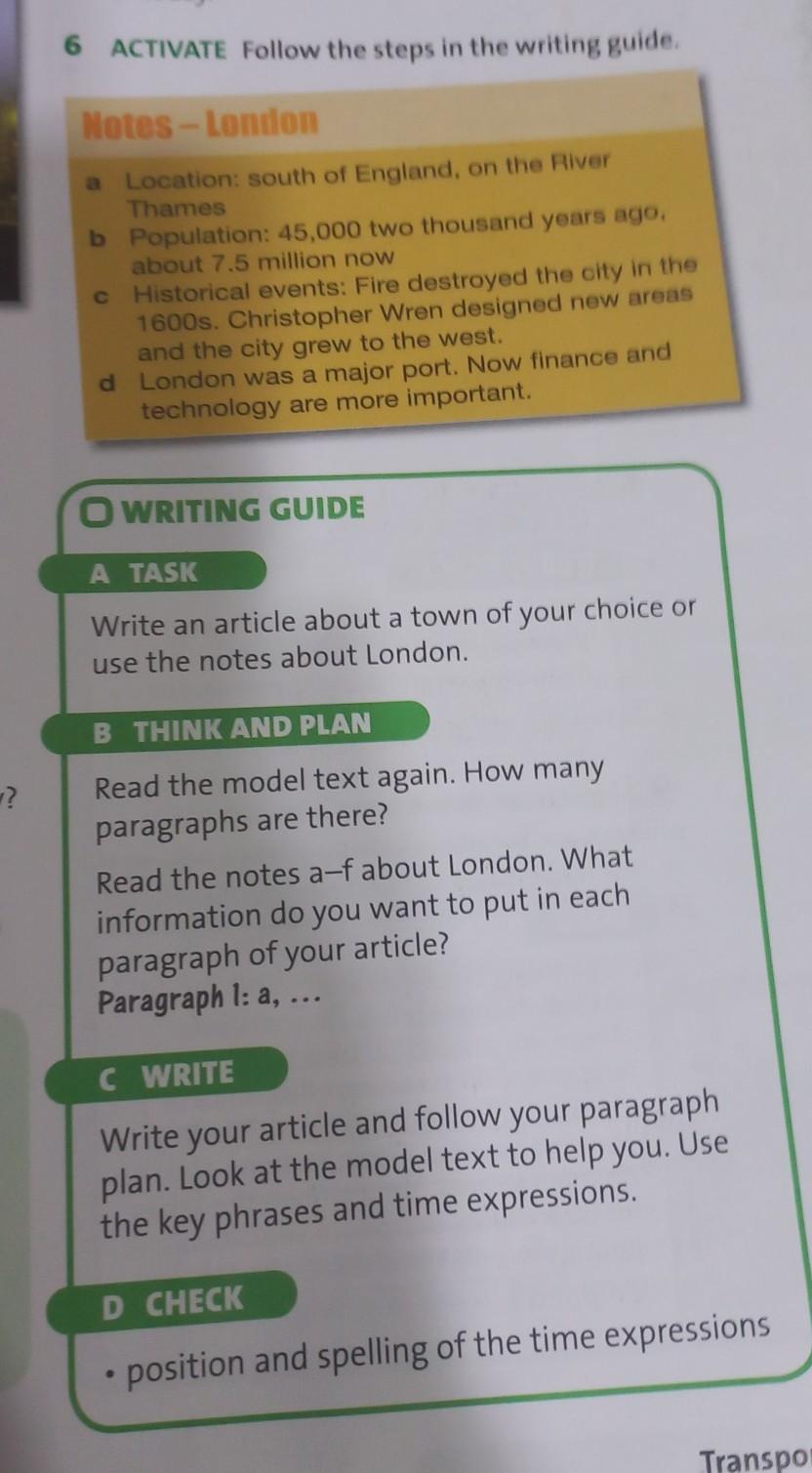 6 ACTIVATE Follow the steps in the writing guide. Notes-London a Location: south of England, on the River Thames b Population: 45, 000 two thousand years ago, about 7.5 million now c Historical events: Fire destroyed the city in the 1600s. Christopher Wren designed new areas and the city grew to the west. d London was a major port. Now finance and technology are more important. OWRITING GUIDE A TASK Write an article about a town of your choice or use the notes about London. B THINK AND PLAN Read the model text again. How many paragraphs are there? Read the notes a - f about London. What information do you want to put in each paragraph of your article? Paragraph 1: a, C WRITE Write your article and follow your paragraph plan. Look at the model text to help you. Use he key phrases and time expressions. CHECK position and spelling of the time expressions