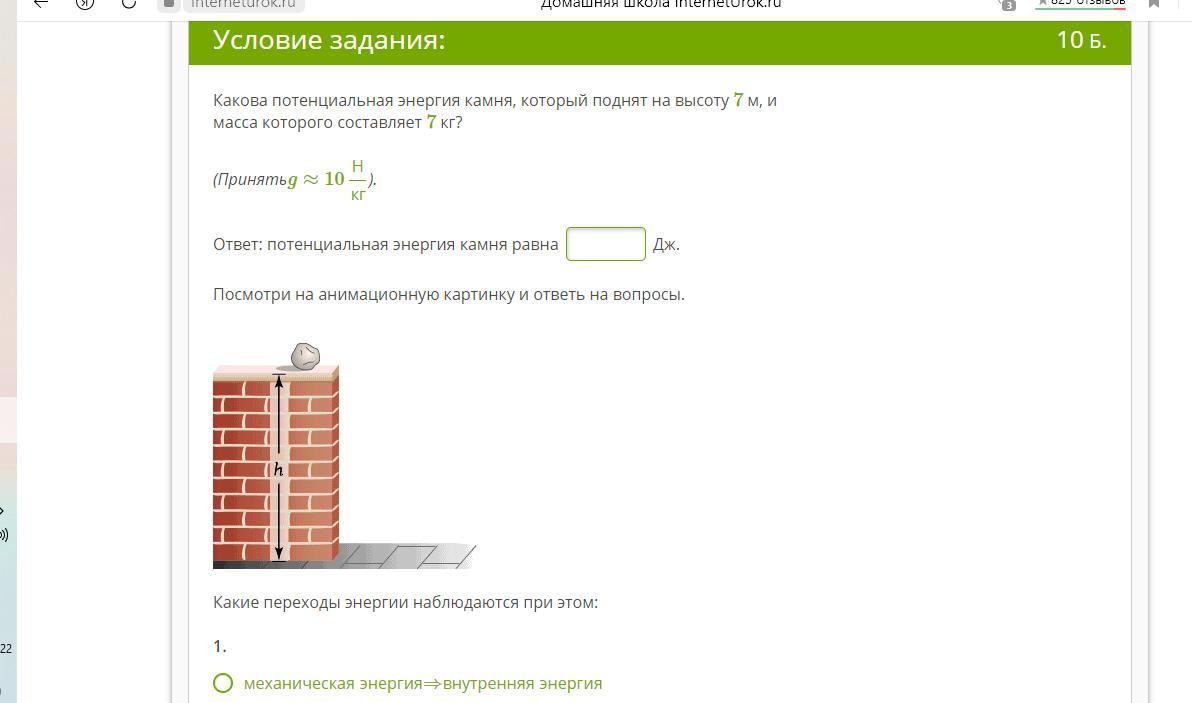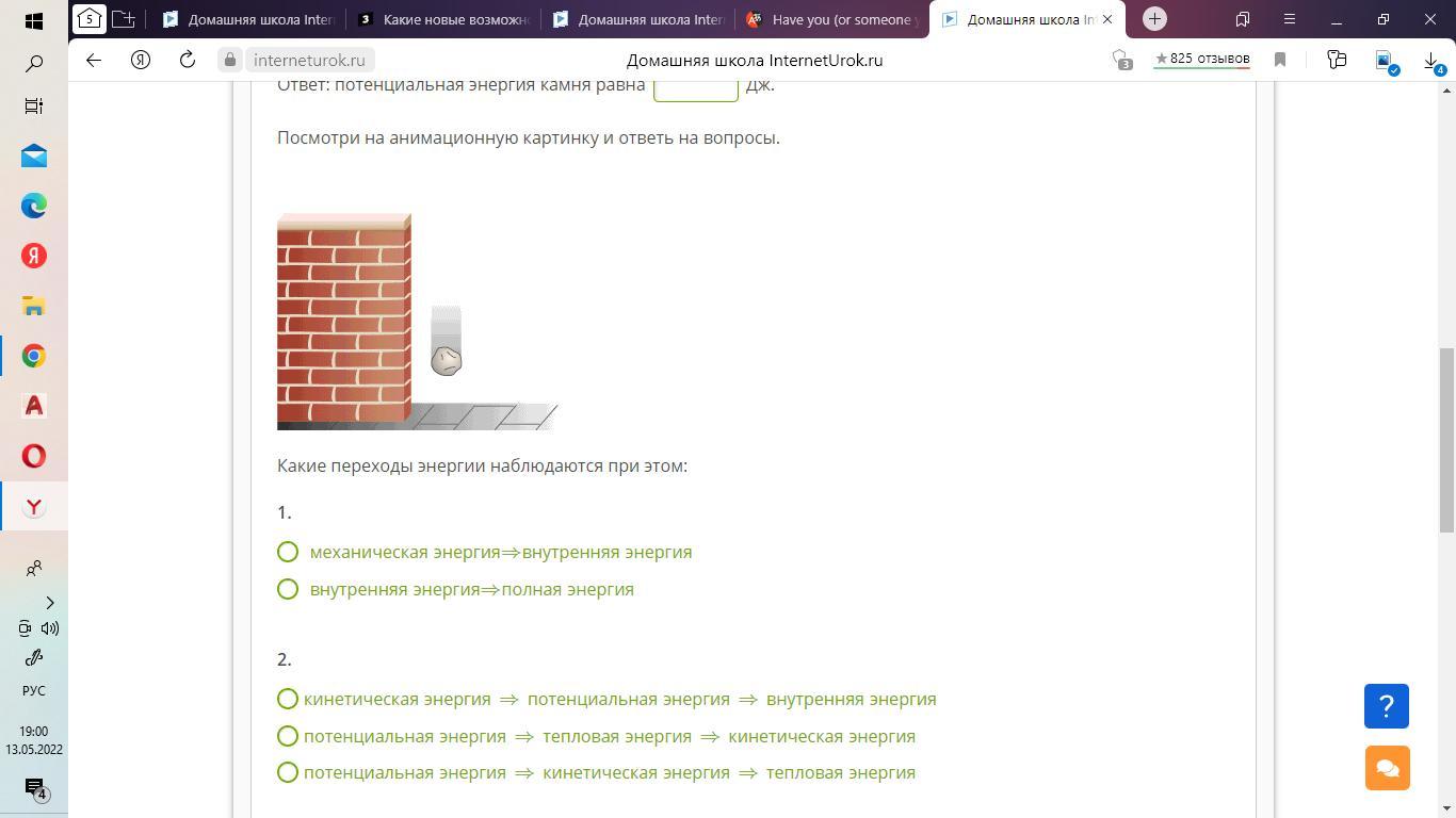 Если правильно понимаю, что на анимации камень падает вниз, то происходит превращение потенциальная энергия - кинетическая энергия - внутренняя энергия. Когда камень на высоте - это потенциальная энергия, падая, он приобретает скорость, а значит Eк увеличивается, Eп уменьшается. Наконец он ударяется о Землю, энергия преобразуется во внутреннюю, камень может нагреться.