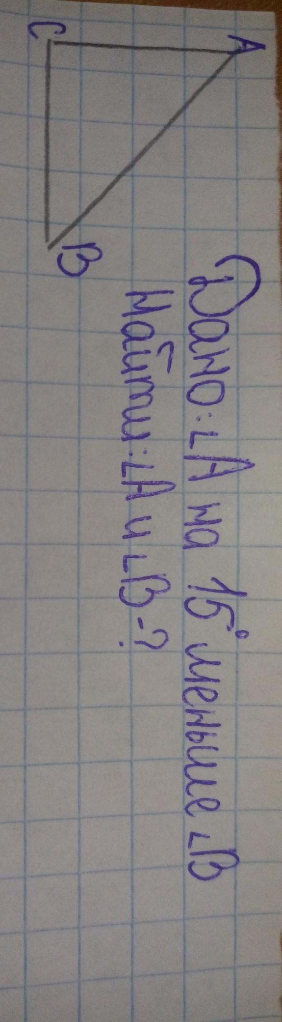 Возьмём ∠ В за х, тогда ∠ А = х - 15°. Составляем уравнение:
