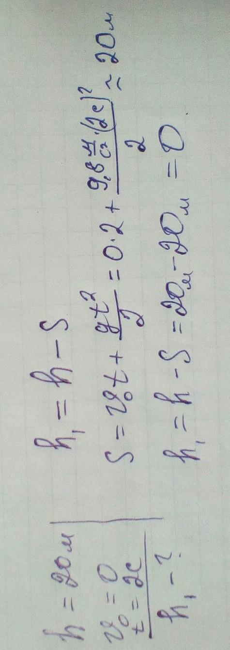 Тело свободно падает с высоты 20 м. Начальная скорость тела равна нулю. На какой высоте оно окажется через 2 с. после начала падения? Сопротивление воздуха пренебречь.