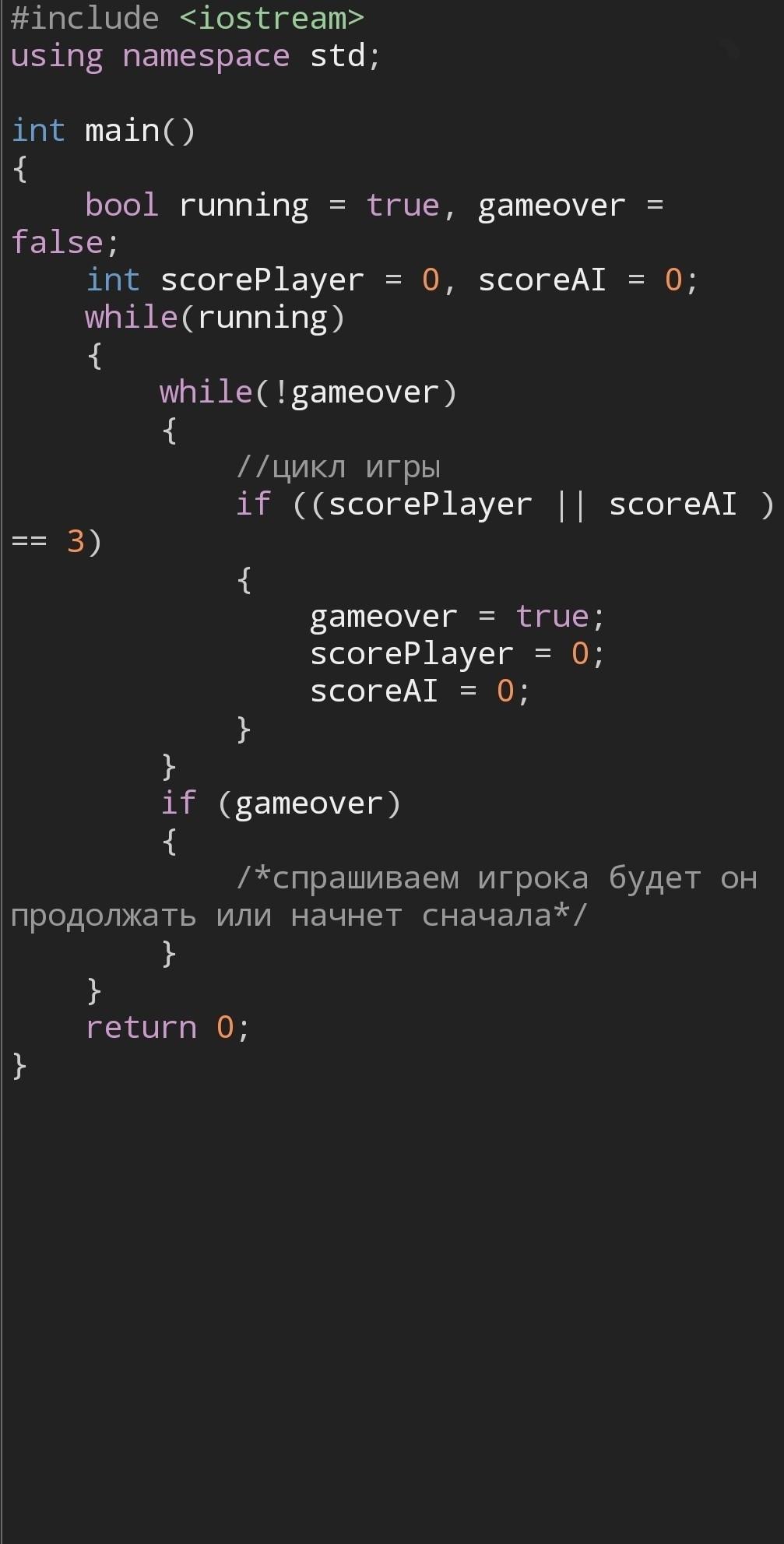 If ((scorePlayer || scoreAI) == 3) — если очки игрока или пк равны 3, то запускается условие. Условие обнуляет очки и ставит игру на “паузу”.