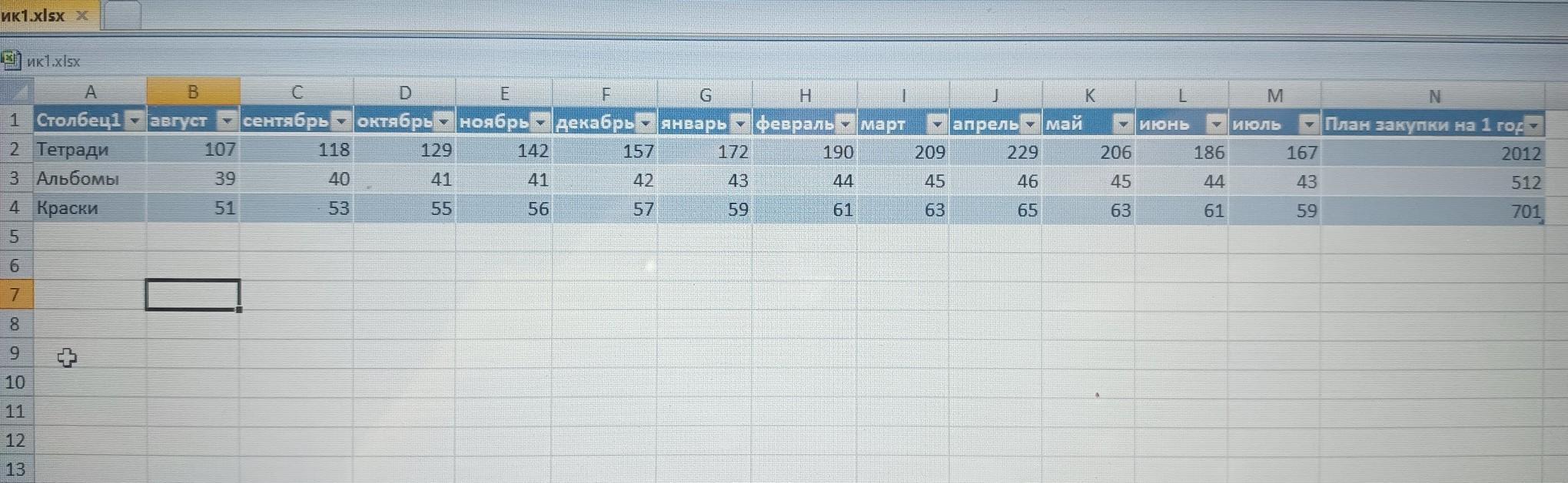 Необходимо запланировать закупку 2000 единиц тетрадей, 500 единиц альбомов и 700 единиц красок (35 баллов).