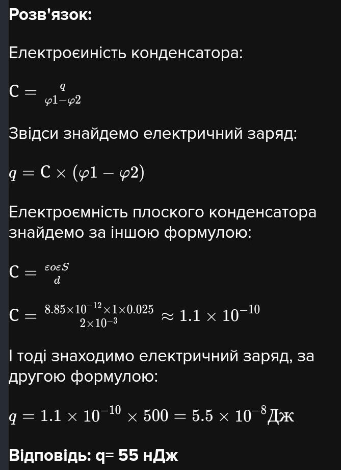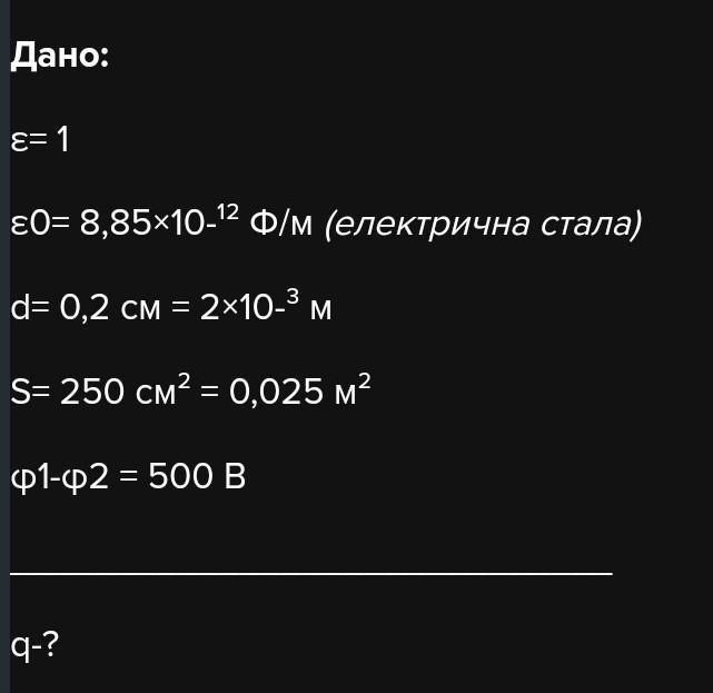 0.2 см . Площа кожної пластини 250 см2 , різниця потенціалів 500 В. Який заряд