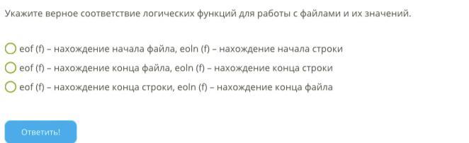 Укажите верное соответствие логических функций для работы с файлами и их значений.