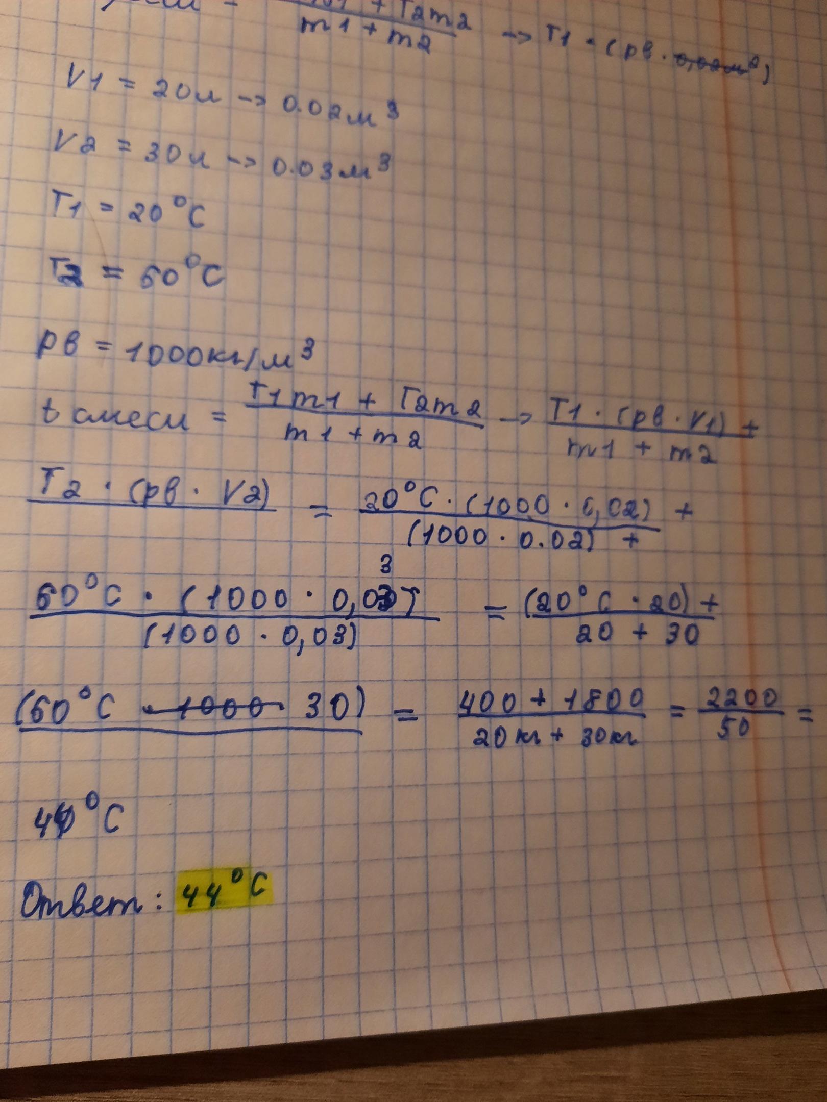 В теплоизолированном сосуде смешали 20 л воды, имеющей температуру 20 °С, и 30 л воды, имеющей температуру 60 °С. Какова температура получившейся смеси?