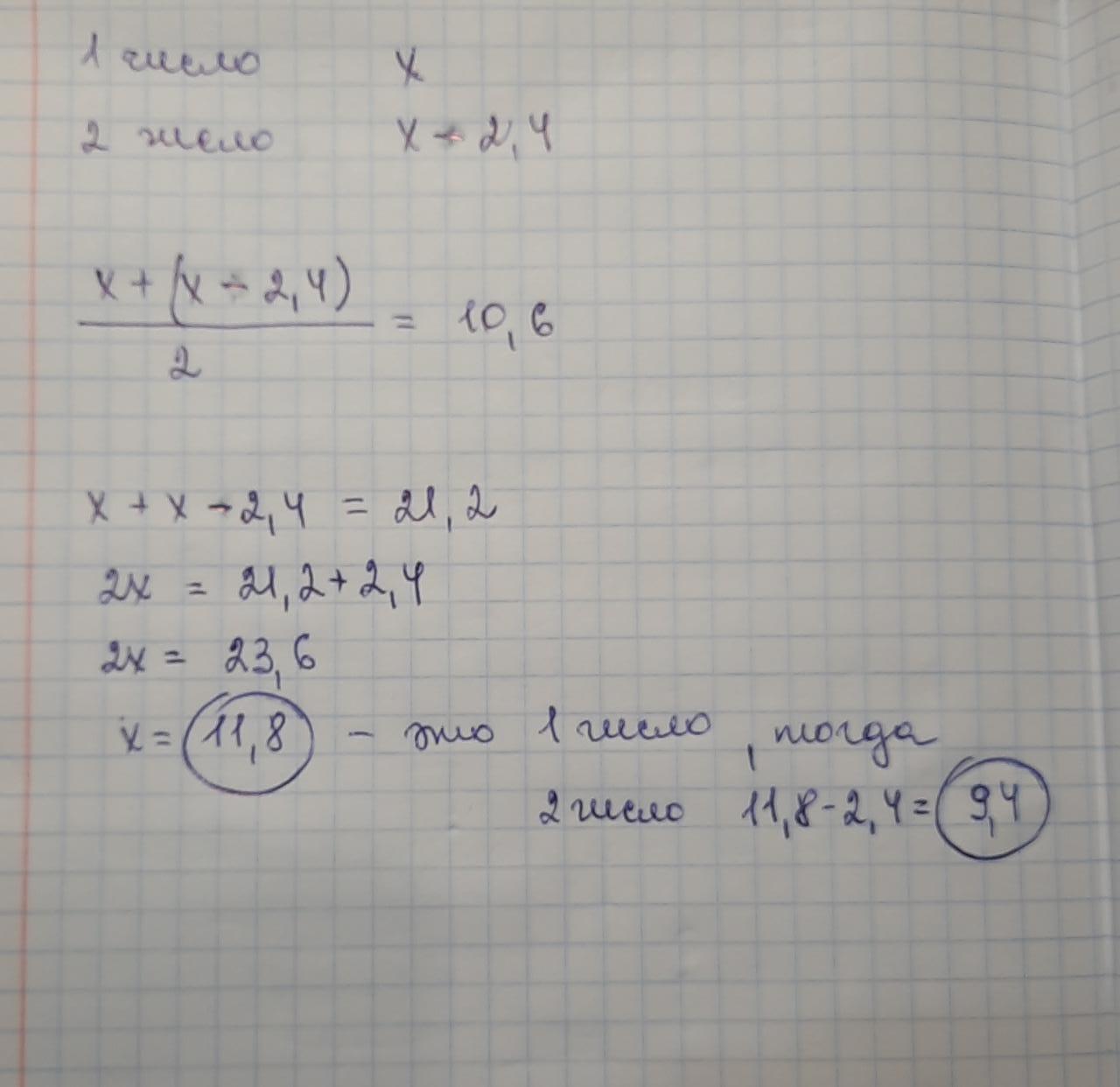 Среднее арифметическое двух чисел, одно из которых на 2,4 меньше второго, равно 10,6. Найдите эти числа.
