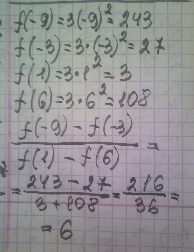 Функция задана формулой f(x) = 3x^2. Вычисли значение выражения f(−9)−f(−3)\f(1)+f(6).