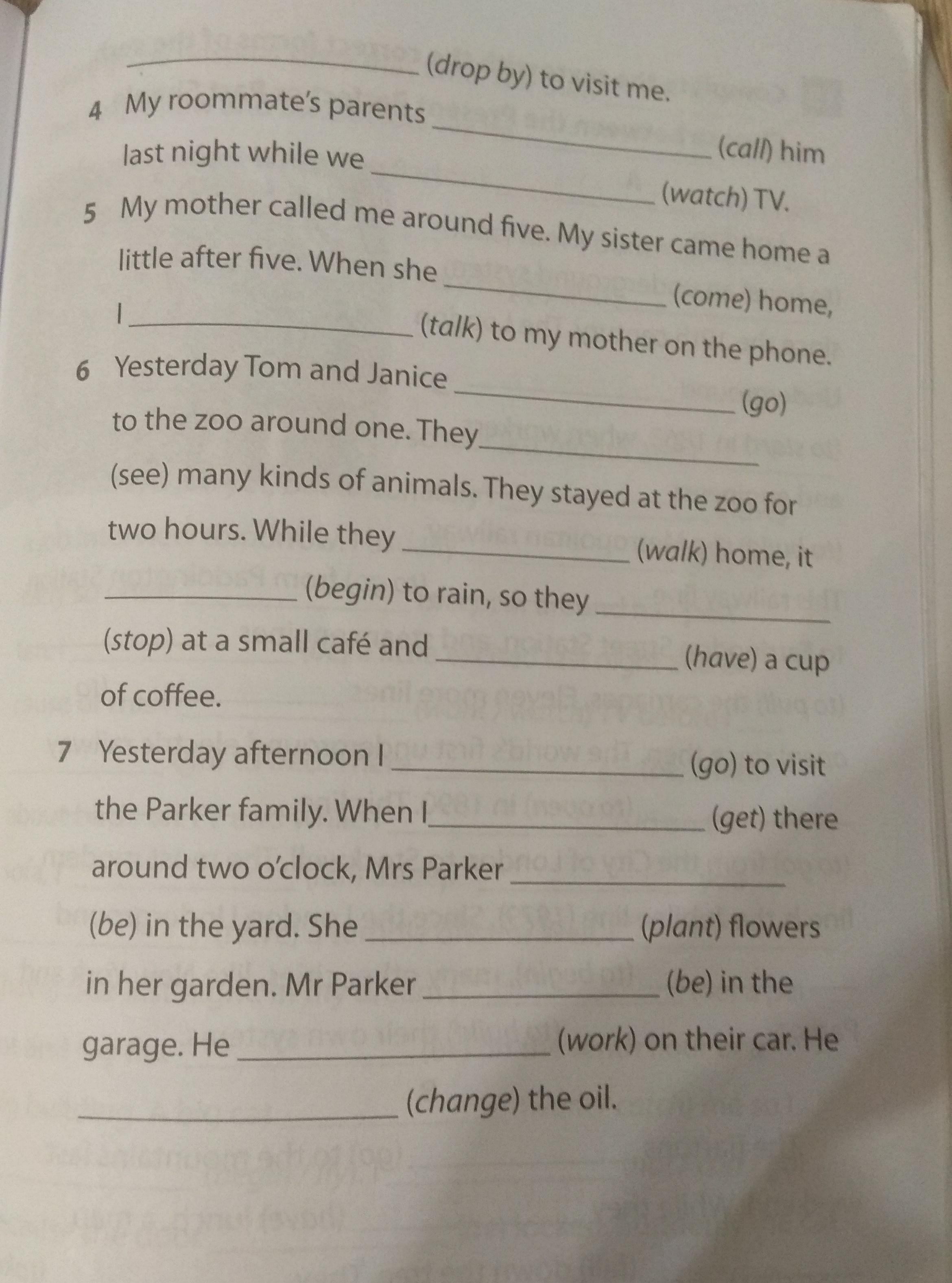 7. Yesterday afternoon I went to visit the Parker family. When I got there around two o’clock, Mrs. Parker was in the yard. She was planting flowers in her garden. Mr. Parker was in the garage. He was working on their car. He was changing the oil.